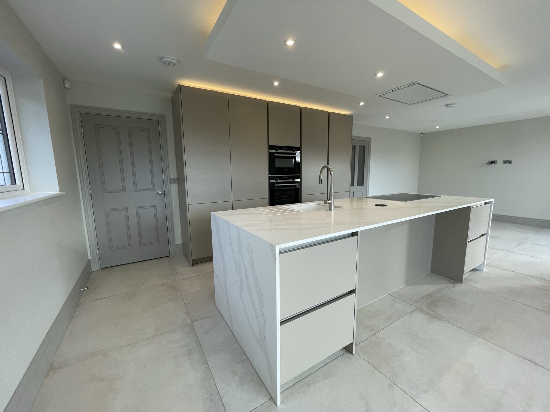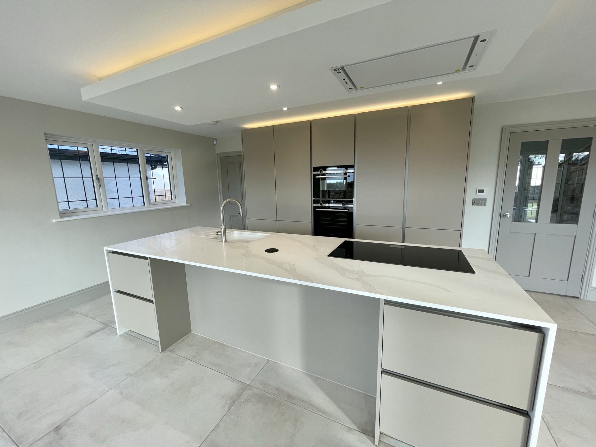 - Professionally designed Stuart Frazer Siematic handleless matt finish kitchen in a choice of colours with 20 mm quartz work surfaces and upstands.